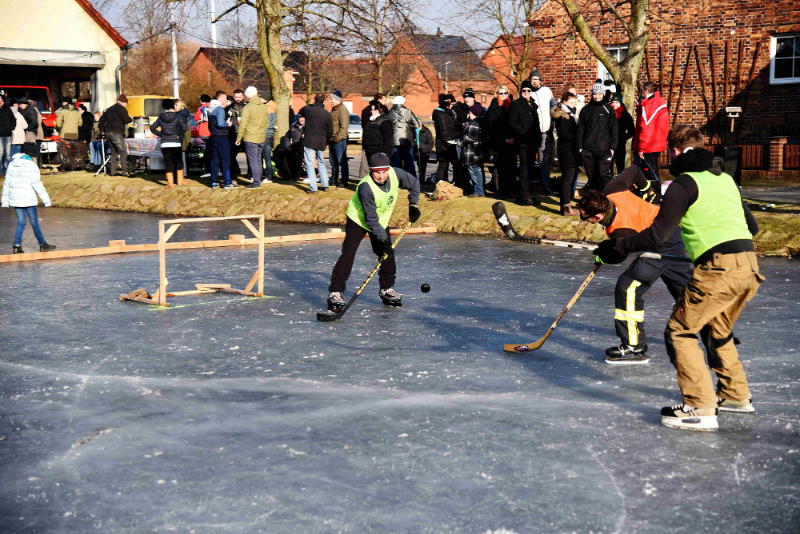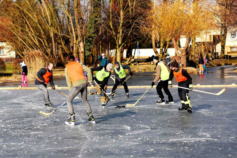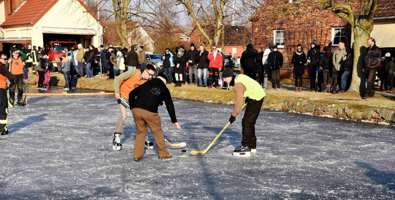 Kurzerhand organisierten Feuerwehr und Lugau lebt alles Nötige und luden am 04. März zum Schlittschuhlaufen und Eishockeyspielen ein. Im Mittelpunkt stand das traditionelle Match Oberdorf gegen Unterdorf, das mit einem 9:6-Sieg der Unterdörfler endete. Angefeuert wurden sie von vielen Besuchern, die ihren Sonntagsspaziergang bei herrlichstem Sonnenschein zum Dorfteich machten.